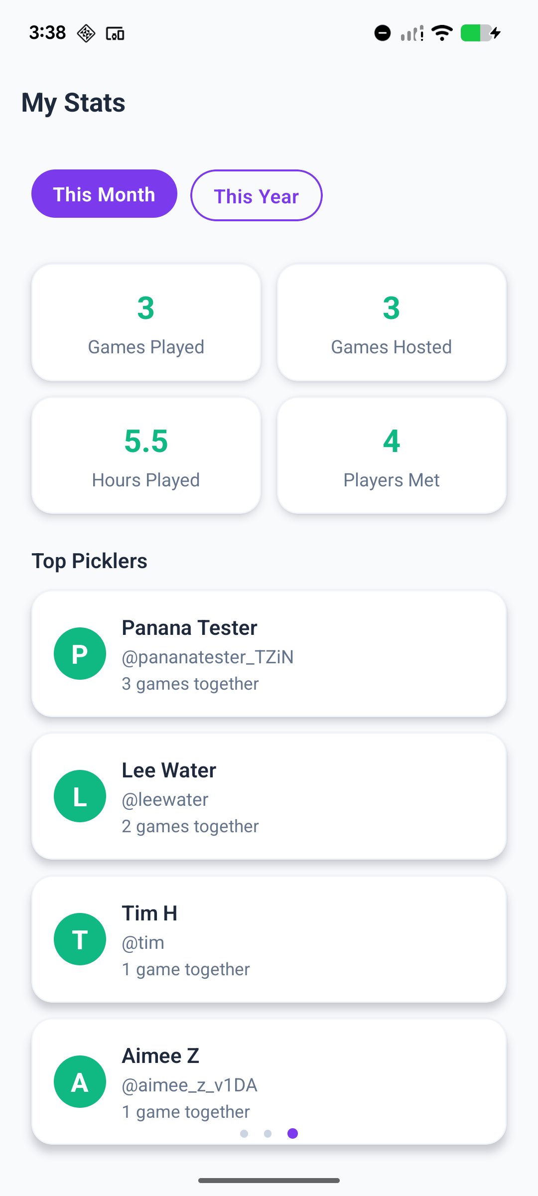 Track your hours on the court, players met, favorite courts, and top picklers — the friends you play with most.