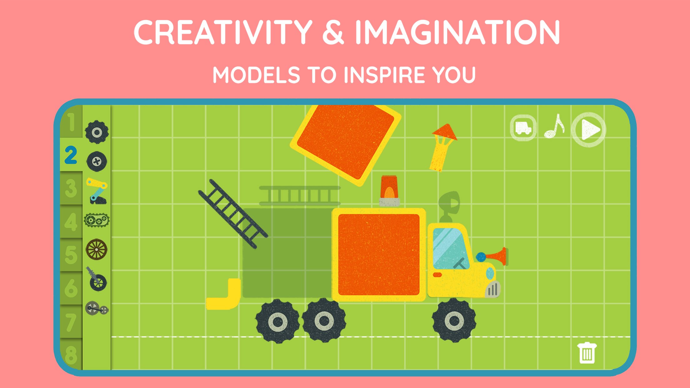 Choose from more than 50 interactive objects: giant wheels, engines, propellers, horns, boosters, a fridge or other unexpected accessories… Combine them freely to create a unique car, with no rules or limits. You can also get inspired by existing models to build a fire truck, a helicopter, a robot or even a submarine.