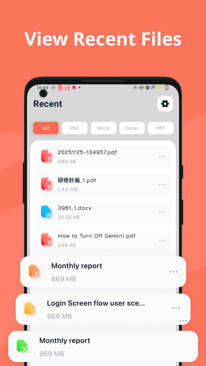 View PDF, Word, Excel & PPT files. Scan images to PDF and manage documents.