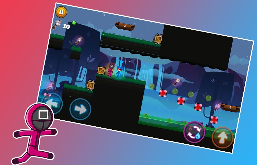 Stickman supreme : blue puppy girl and red squid boy adventure is an addictive adventure game where you have to synchronize two characters. Control both stickmen at the same time and use the buttons to move, push boxes and collect key to reach the exit in the forest.