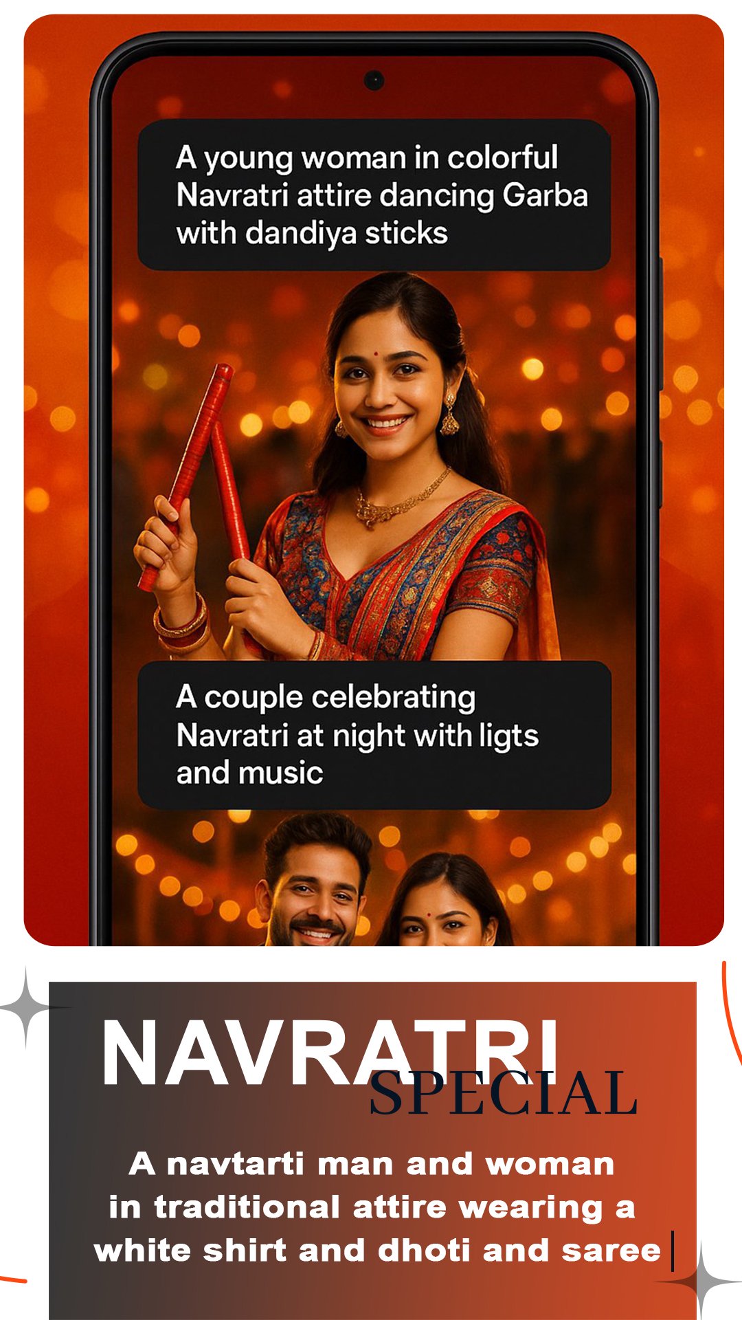 🎉 Discover unique ideas — from festive Navratri celebrations to traditional South Indian attire, or from modern fashion portraits to imaginative fantasy art. Simply copy and use these prompts with your favorite AI image generator to create stunning visuals.