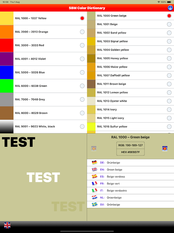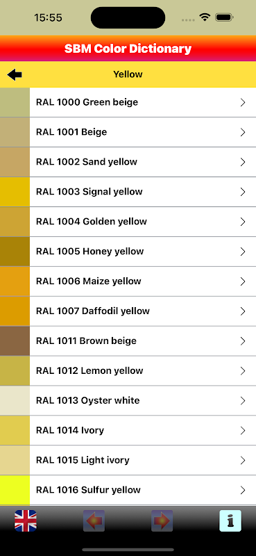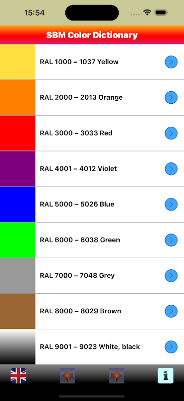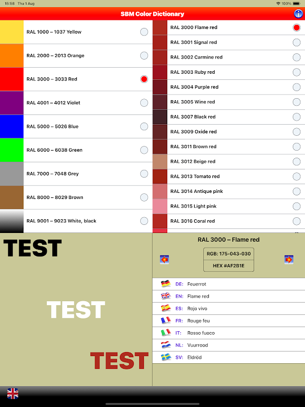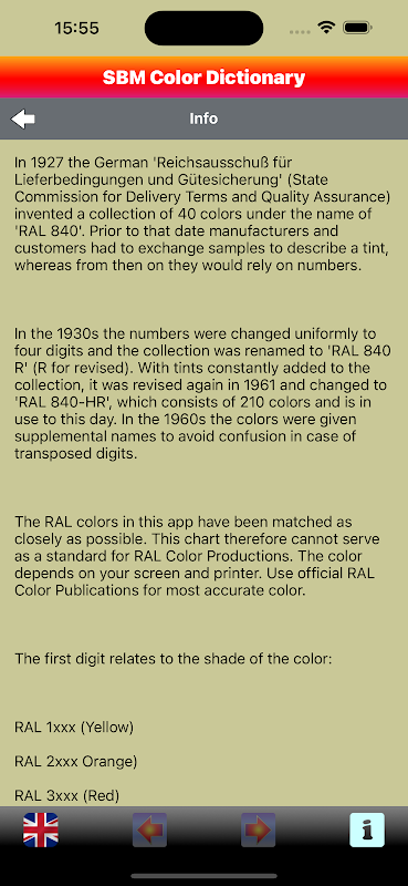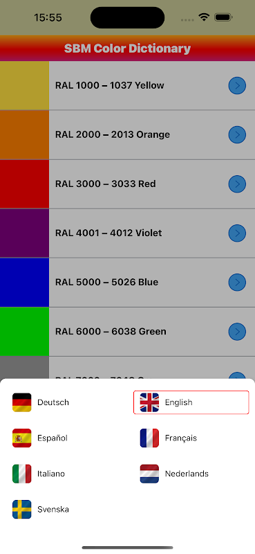 Now NEW with color names in German, English, French, Spanish, Italian, Dutch, and Swedish. This app serves as a dictionary of color names and their representations in the RAL color system.