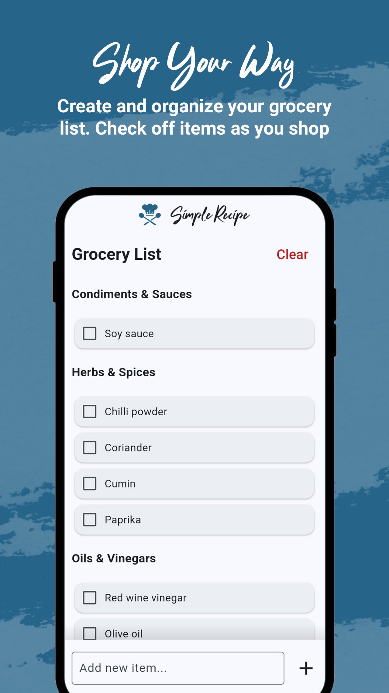 Skip downloading a separate grocery list app and use Simple Recipe to create your grocery lists. You can easily add and remove ingredients from recipes to your grocery list. Add your own grocery items and organize your list to your liking. When you're ready to shop, you can check off items in the grocery shopping app as you add them to your cart.