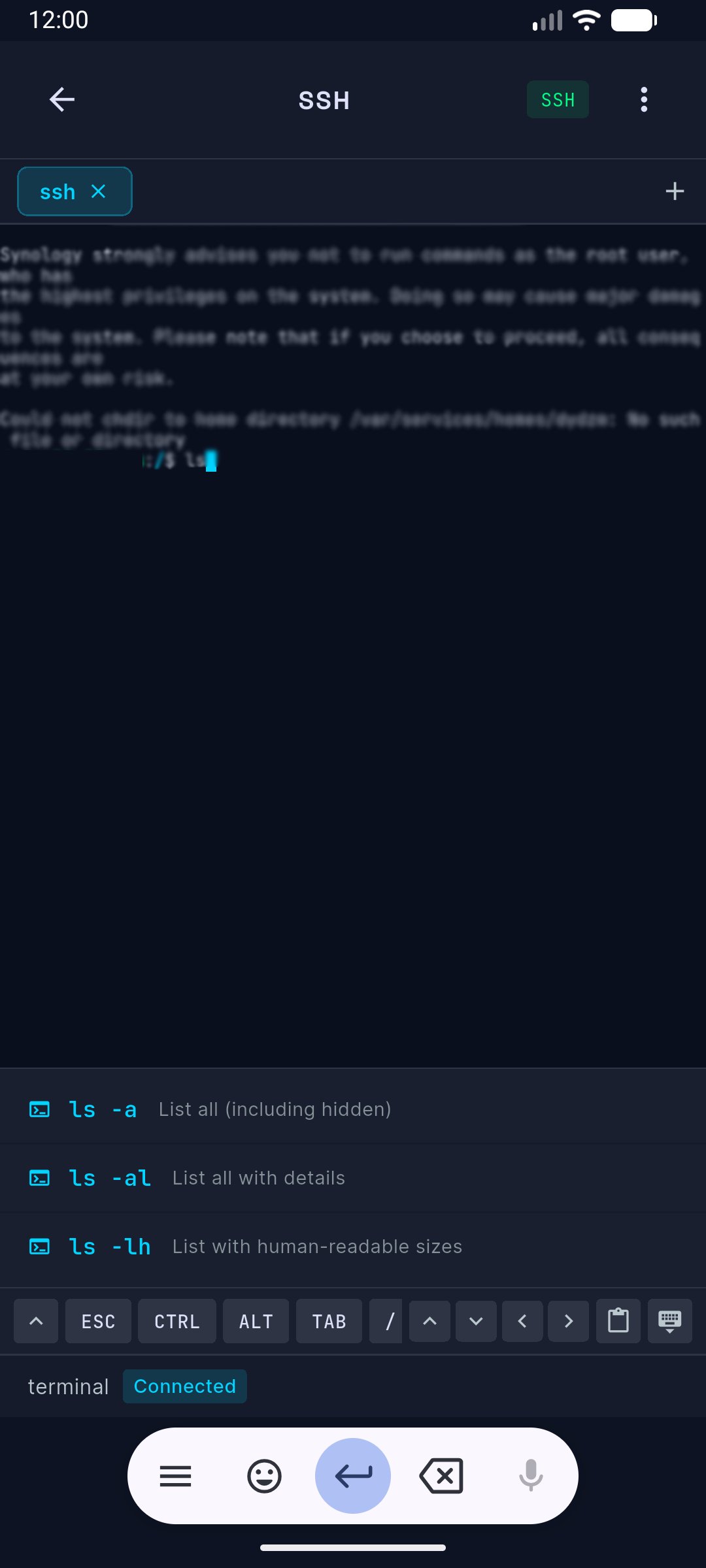 The keyboard toolbar puts Tab, Ctrl, Esc, and arrow keys above the on-screen keyboard. No more hunting through three pages of special characters to type a pipe symbol. SSH sessions stay alive when you switch apps or lock the phone, so you don't lose your shell every time you check a notification.