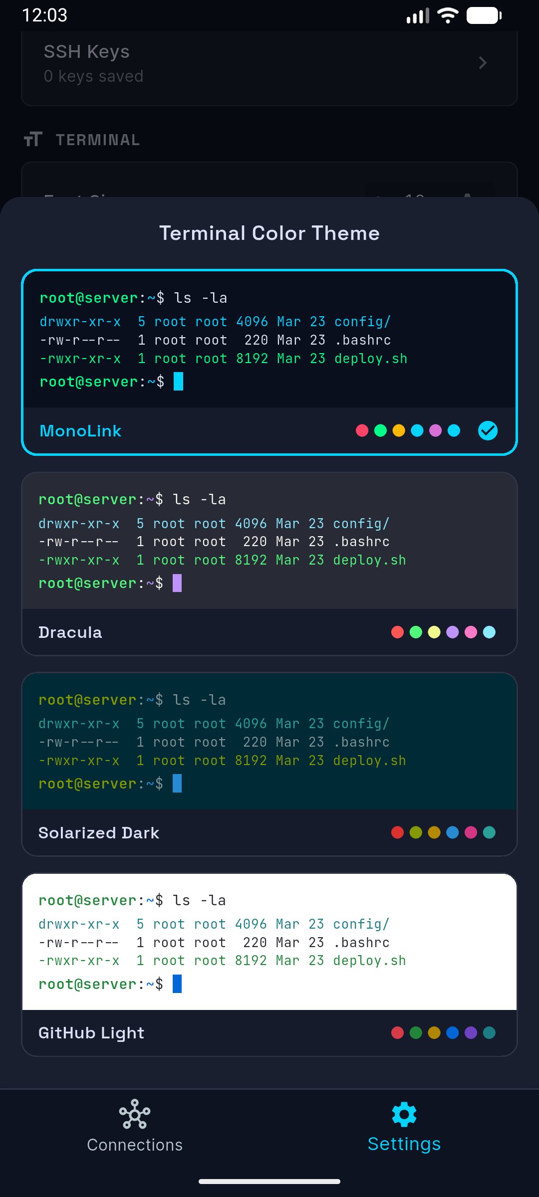 That's what this SSH client is built for. Not a port of a desktop tool, not a thin SSH wrapper around a web shell. A terminal that respects that you're holding a phone.