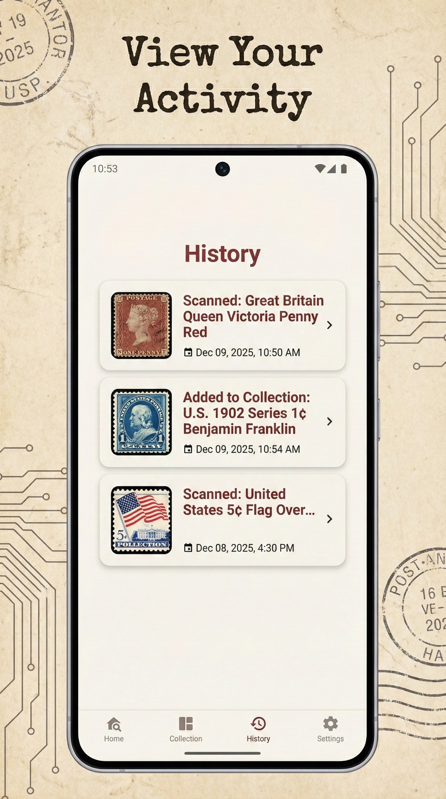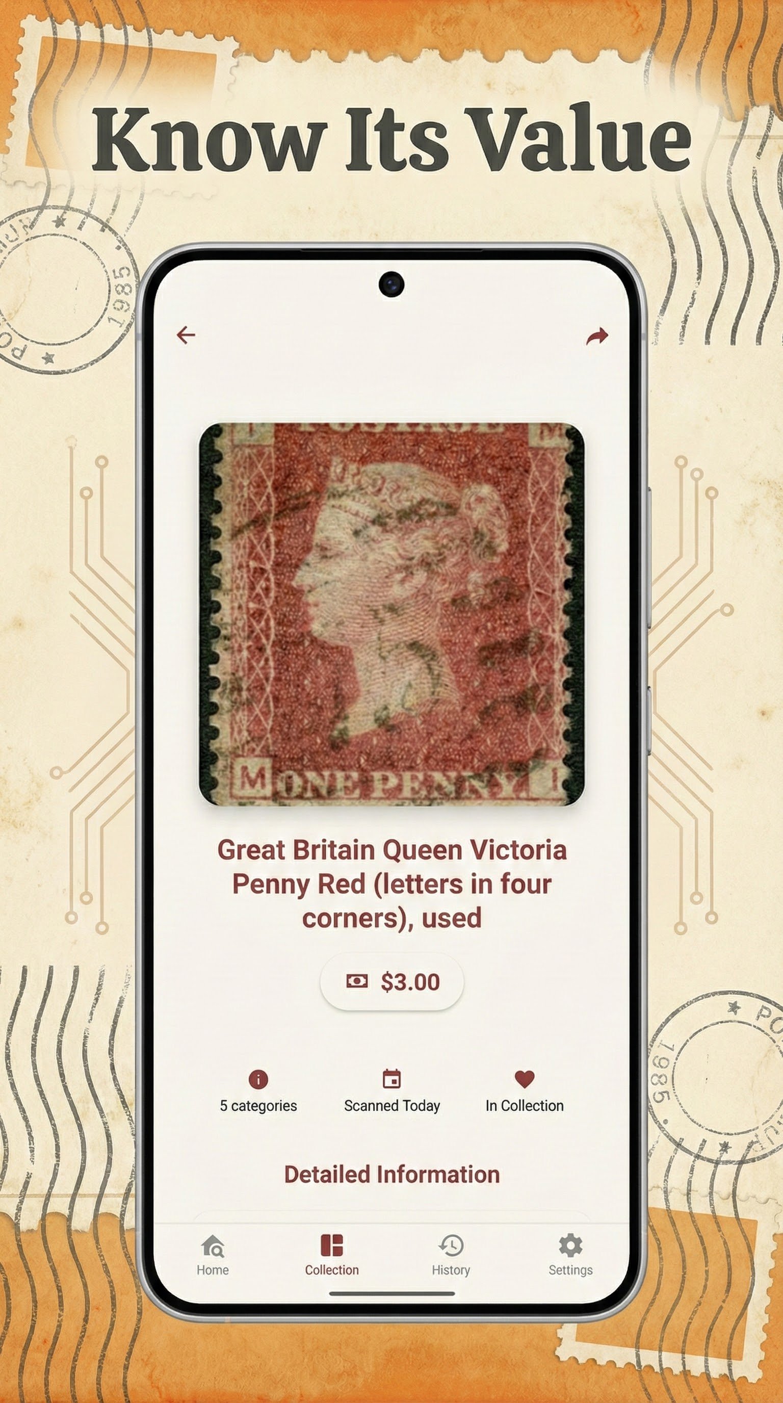 Simply scan a stamp or upload a photo to identify stamps and check their value instantly with AI.