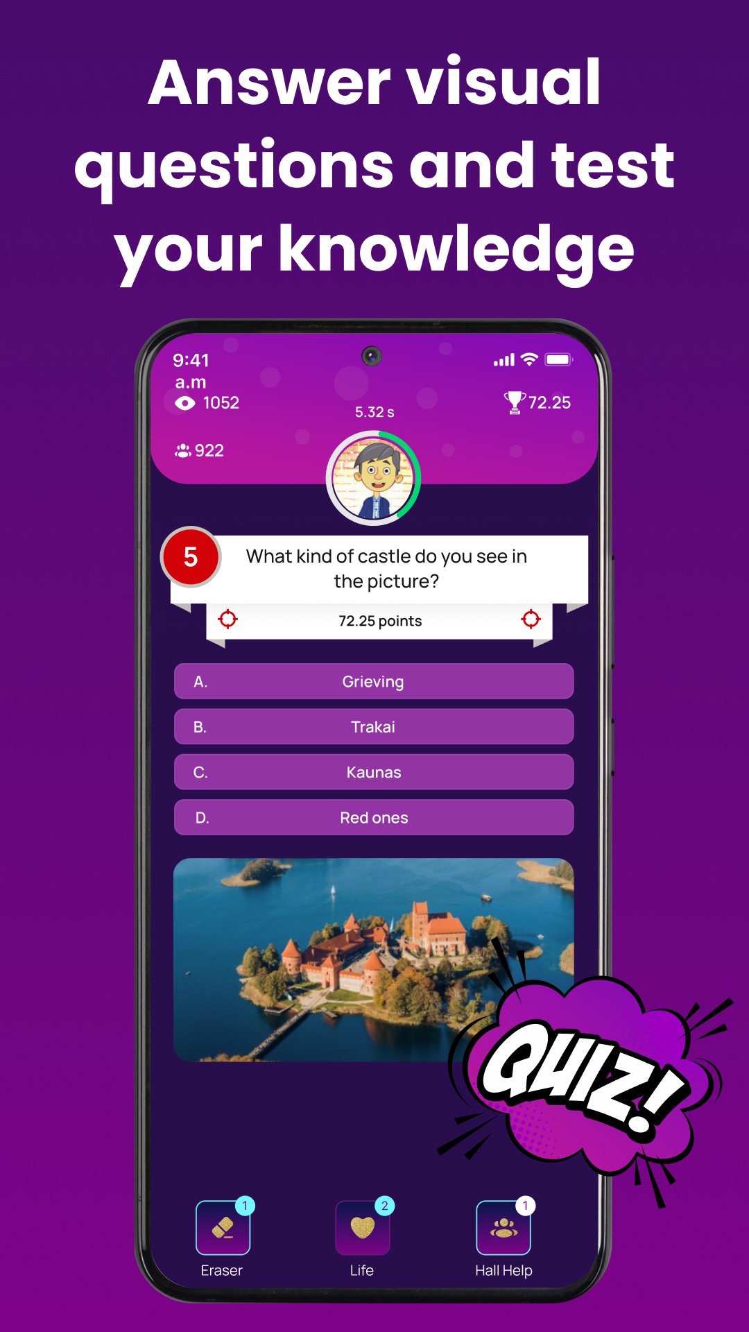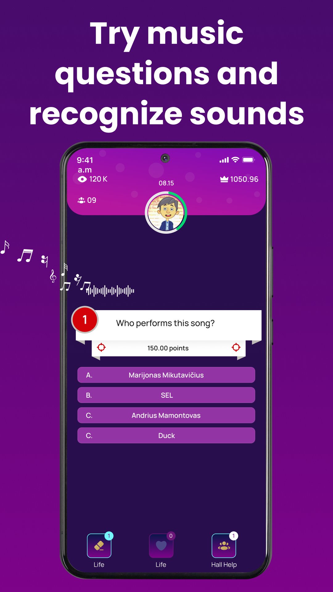 Answer text-based, visual, and music questions, earn points, and see your position on the leaderboard.