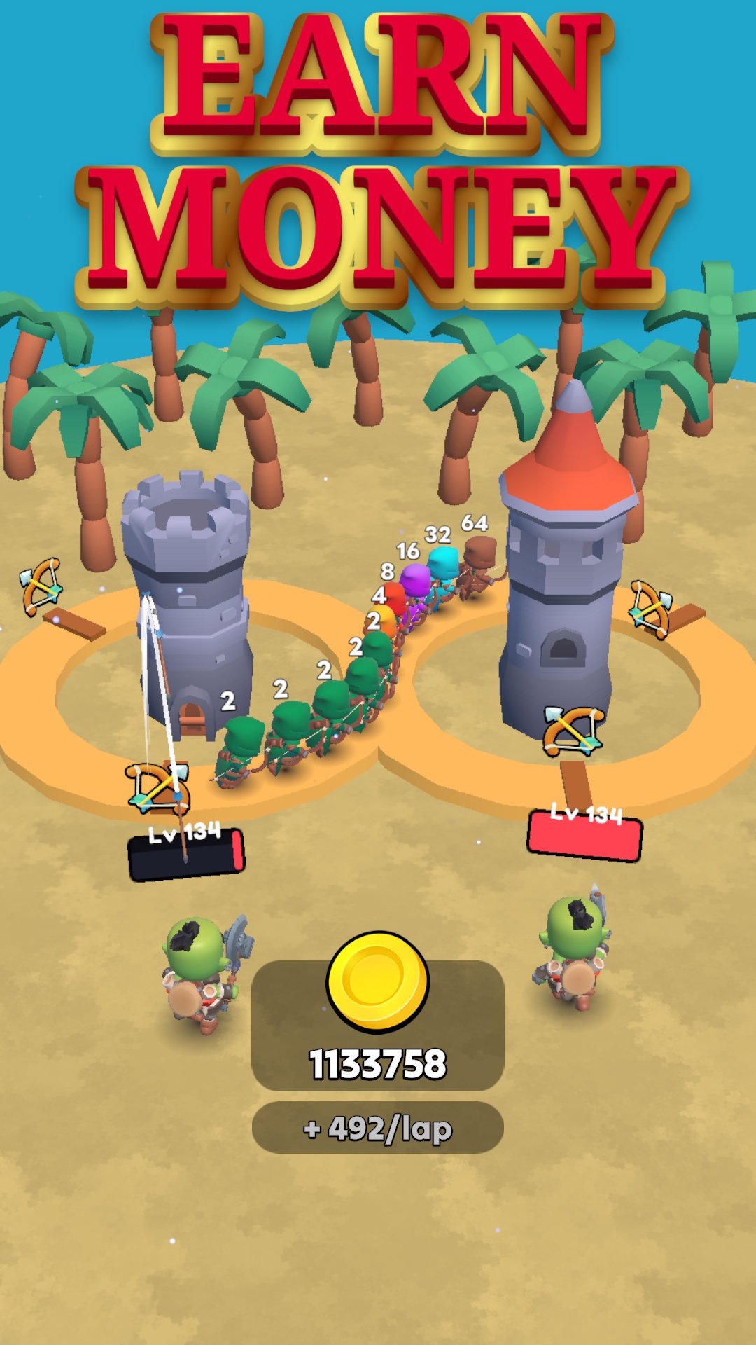 Your archers fight on their own! Face stronger and stronger monsters and collect more gold with every loop.