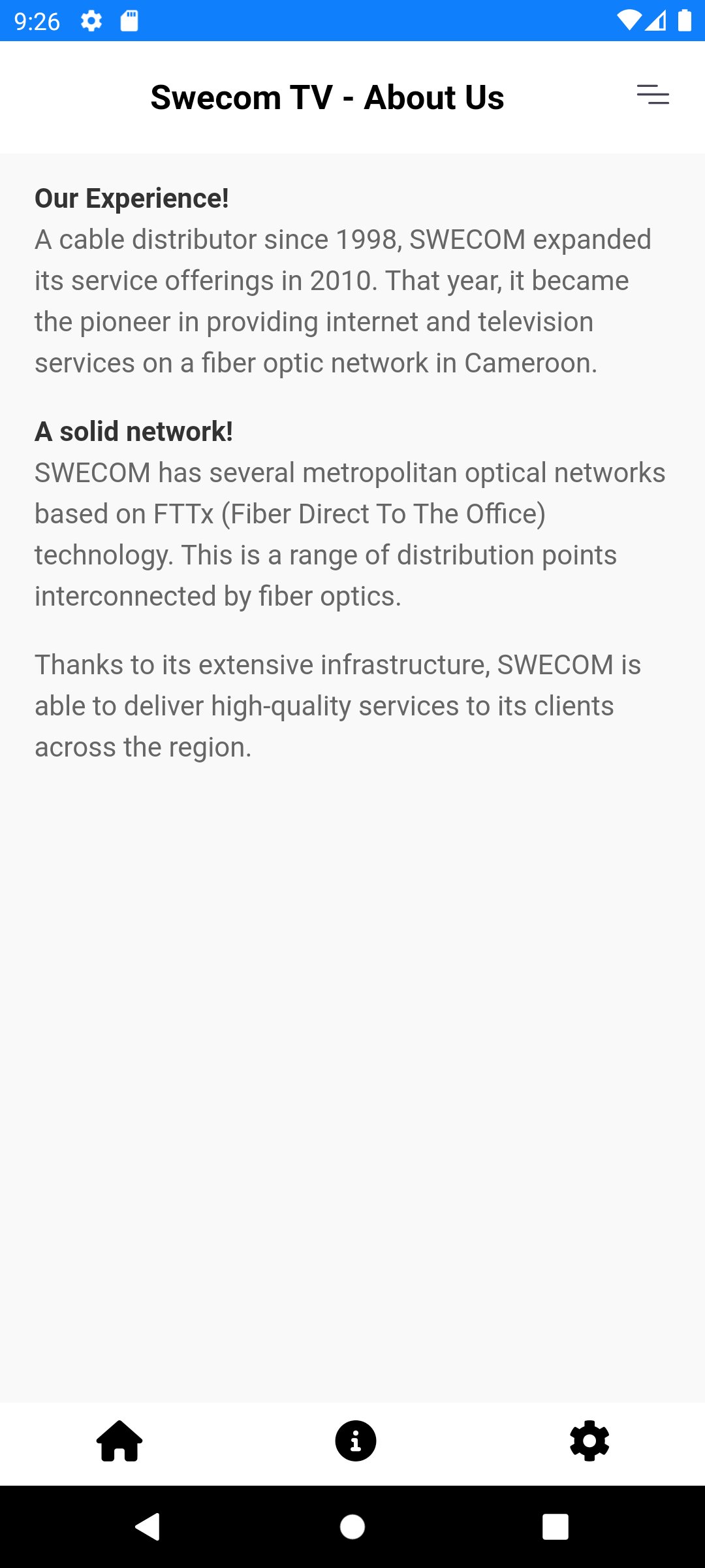 Swecom tv, brought to you by SWEsat, provides a digital presence for all free to air satellite channels being transmitted to the satellite my SWEsat, regardless of your location. Whether you're traveling or living outside the satellite coverage range, Swecom tv ensures you stay connected to your favorite tv channels. With an intuitive interface and high-quality streaming, Swecom tv delivers the best of our satellite televisions right to your device. Get more information from our website https://www.swecom.cm. You can access and watch live all channels uplinked to the satellite by SWEsat with Swecom tv application.