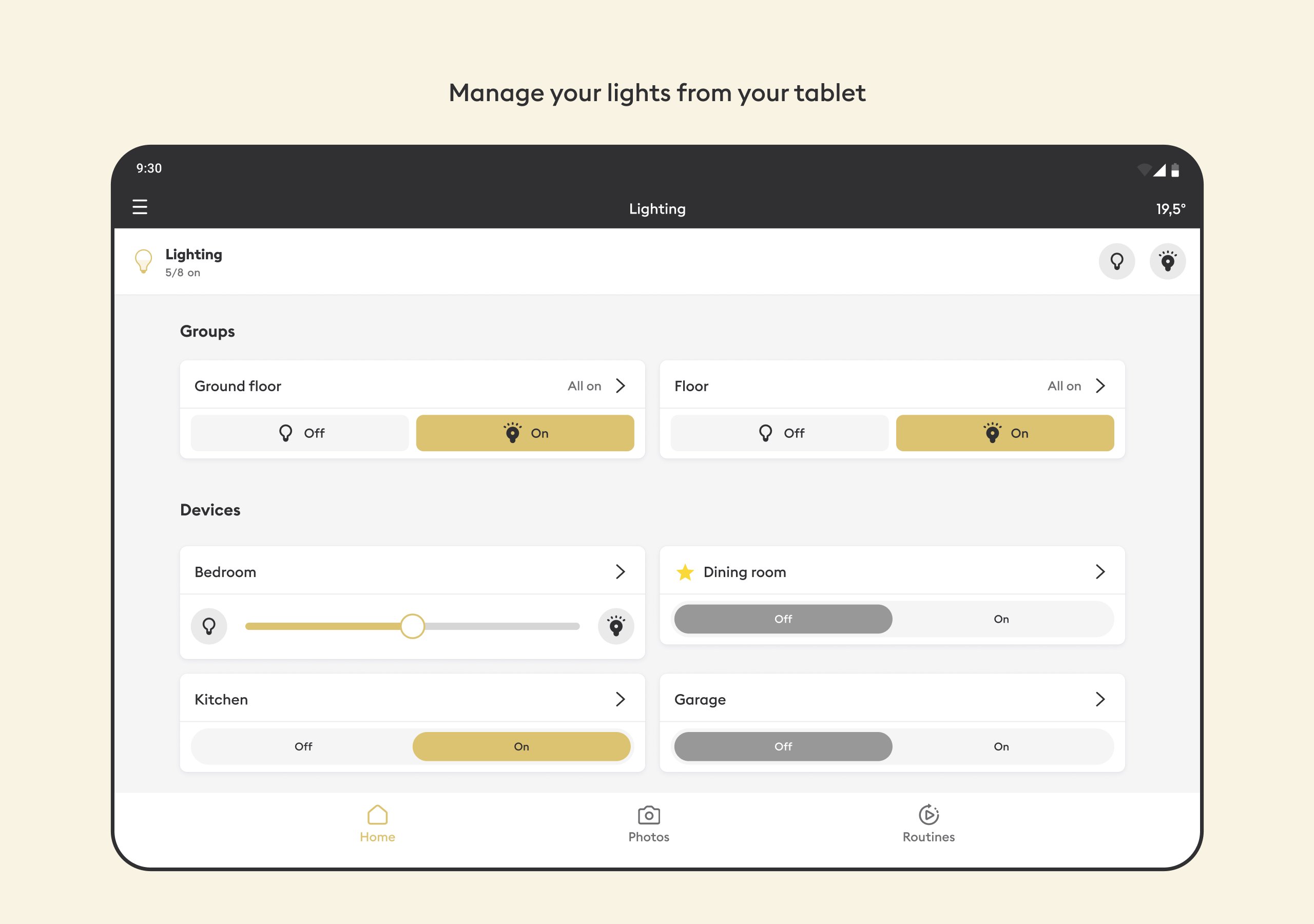 Include photos of your interior, add the control icons of your smart devices and monitor them wherever you are!