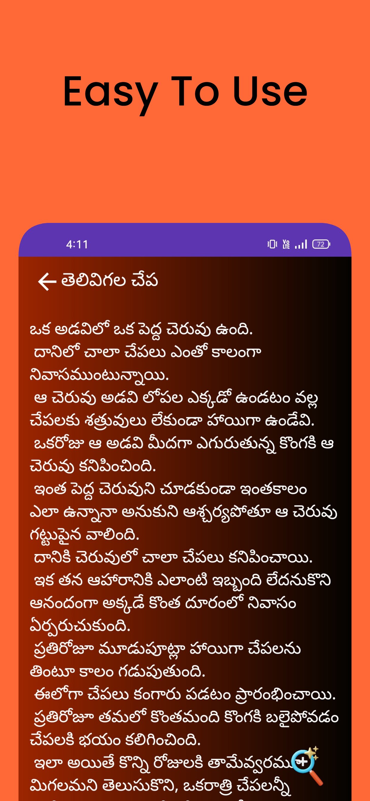 The Telugu Stories application has simple vocabulary and grammar knowledge according to the story topic for students of the Telugu language.