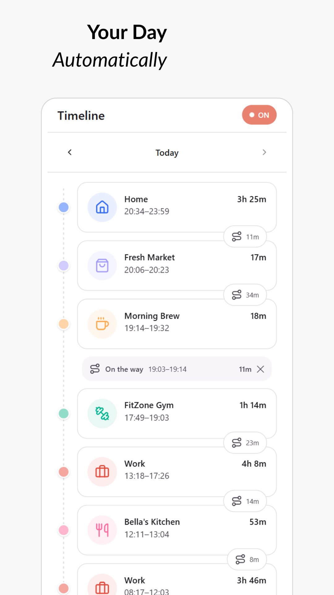 See your day organized as visits and journeys. Know exactly when you arrived and left each place.