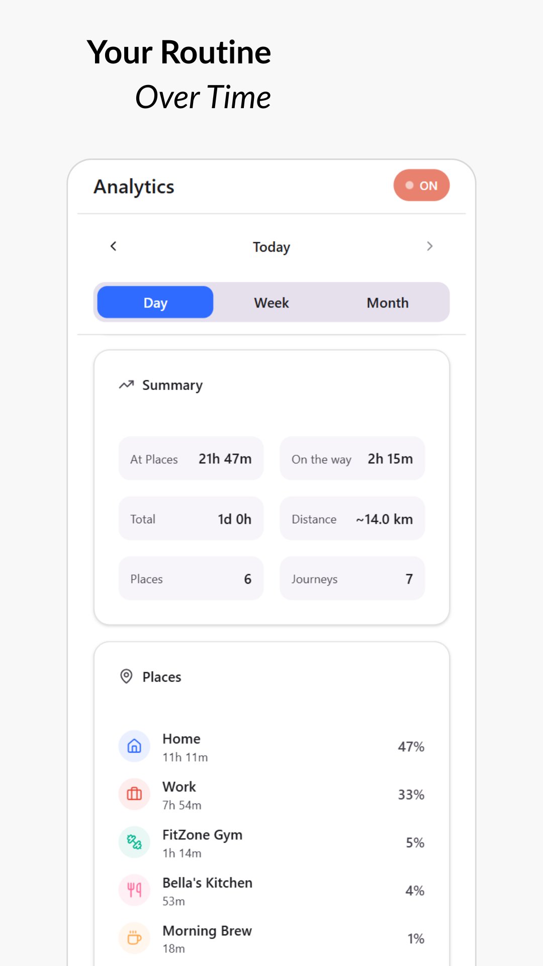 • Analytics to see your patterns and most visited spots