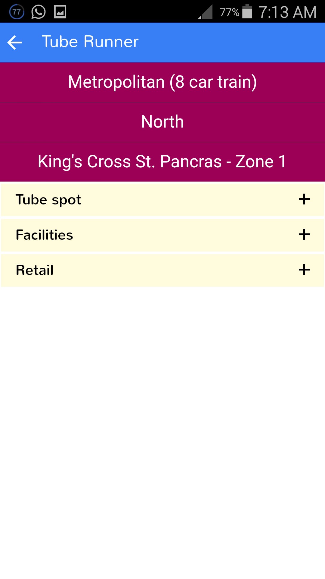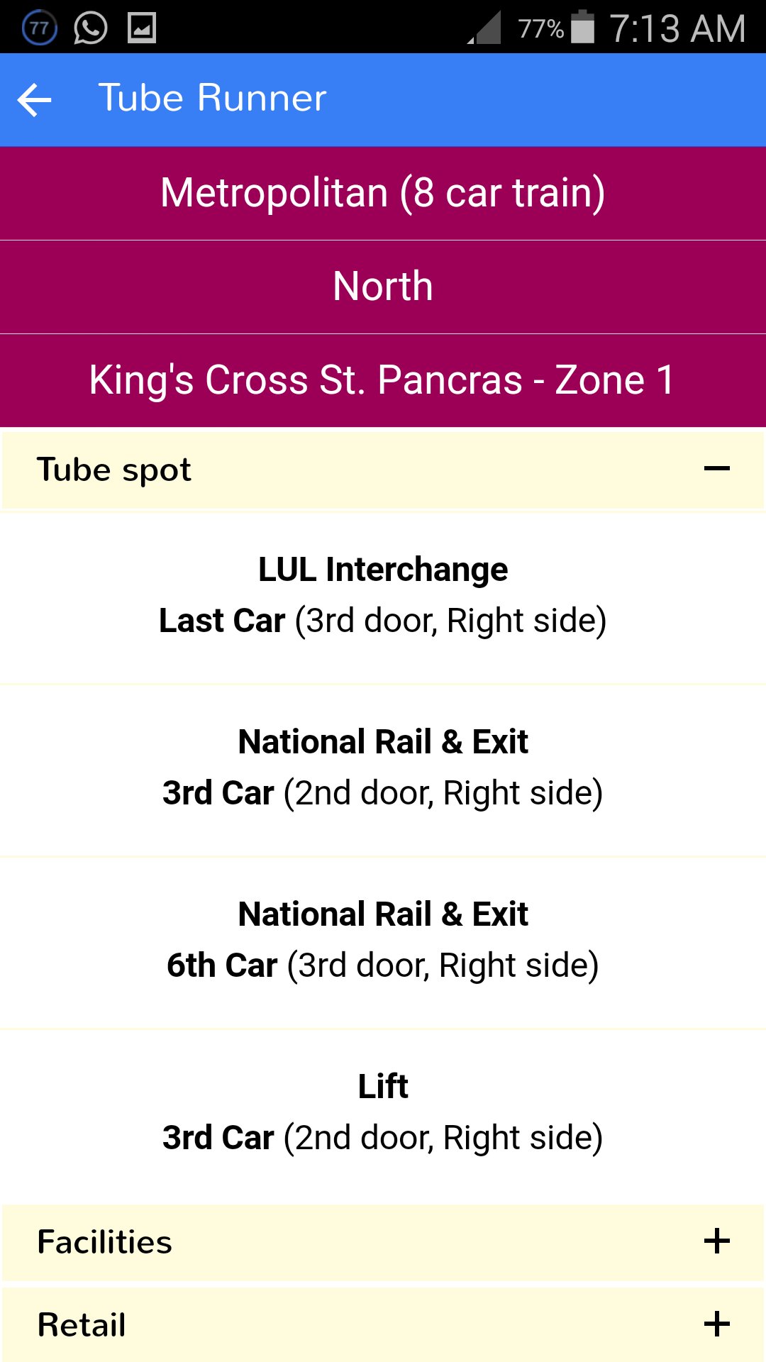Apart from providing general information on London Underground stations (major closures, nearby places of interest, available facilities, nearby retailers, step-free access and first/last trains) the Tube Runner application also informs you of the closest train door to your destination when alighting at that station.