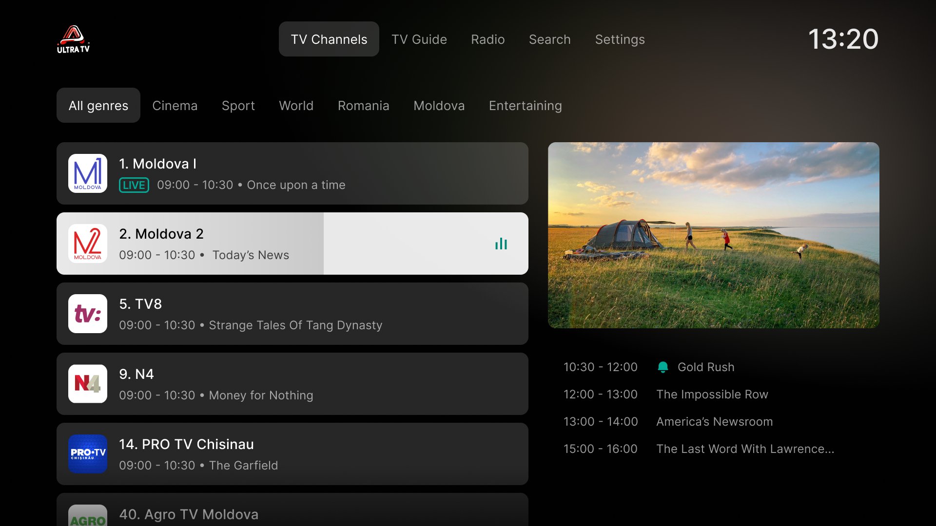 Moldovan channels, including a variety of entertainment, sports, news and international programs