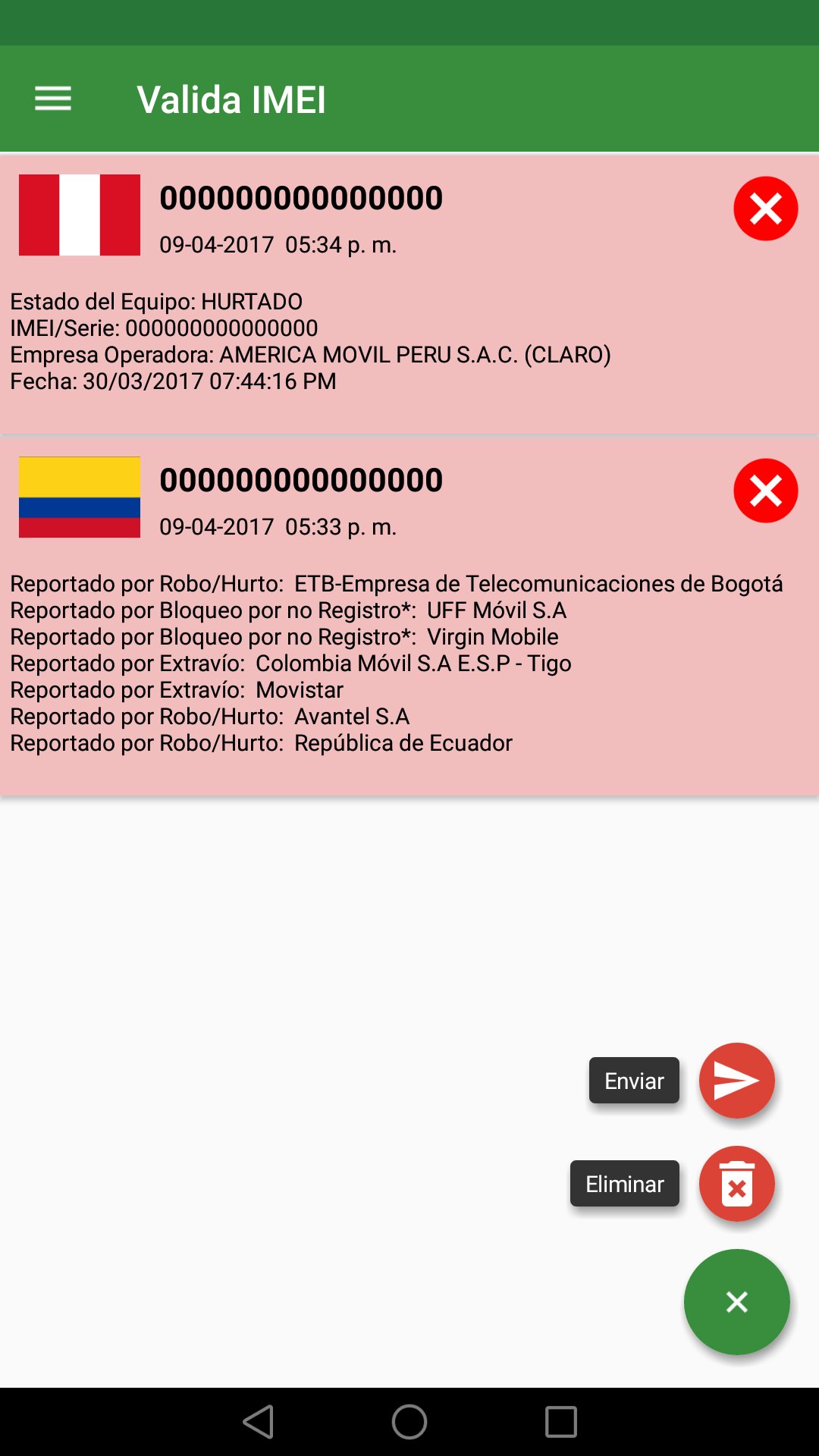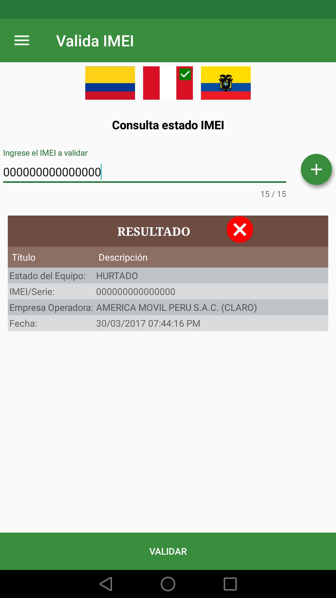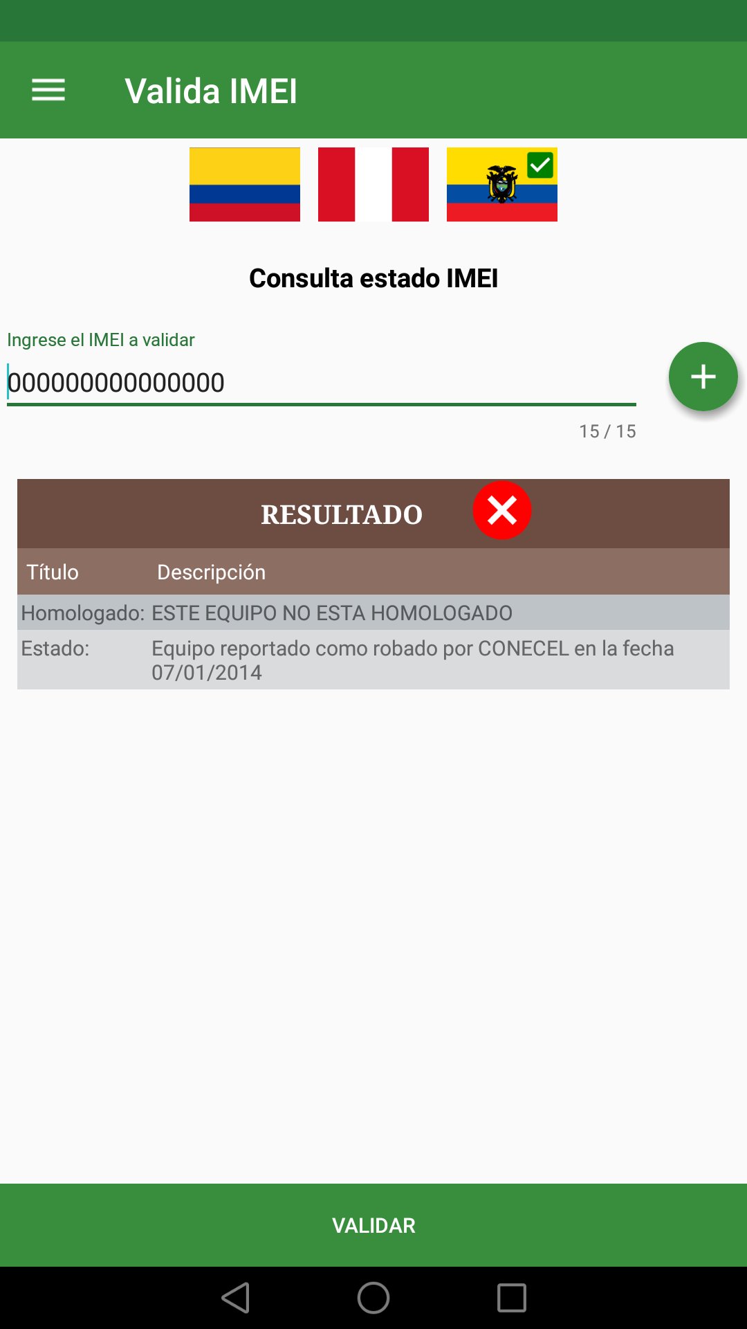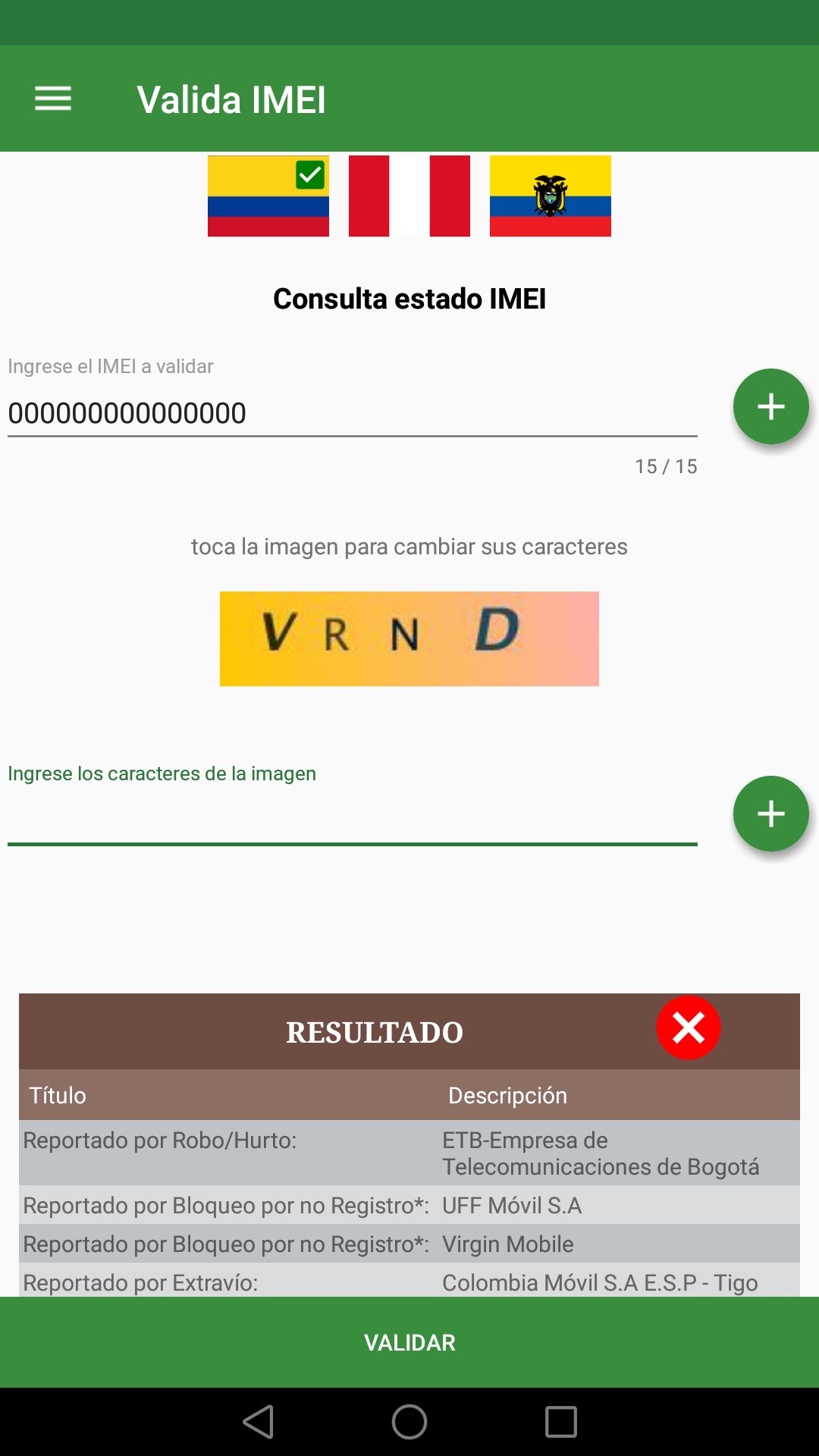 Valida IMEI es una aplicación que permite consultar si el IMEI de un terminal móvil se encuentra reportado en una base de datos negativa.