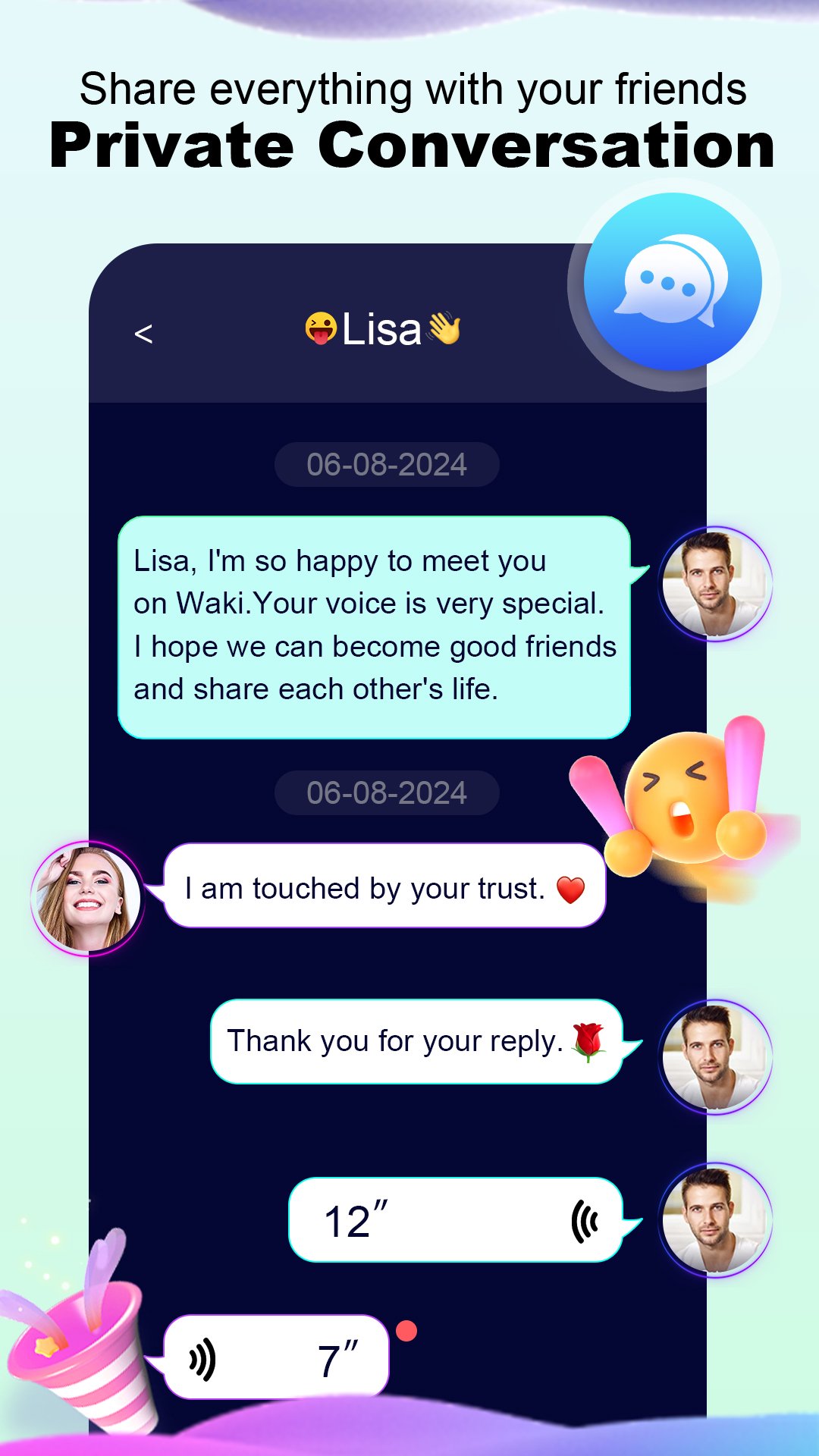 Add your favorite friends to your contact list for private voice messages and texting, and share your beautiful photos. You can also create a private room for unrestricted conversations with your friends.