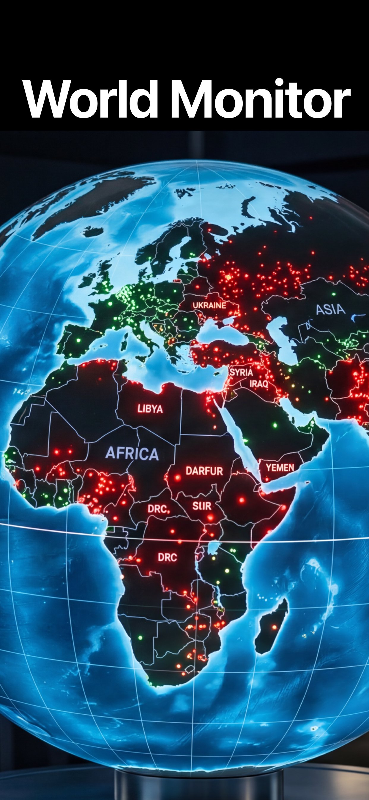 World Monitor App is your real-time global intelligence platform. Stay informed about conflicts, cyber threats, natural disasters, military movements, and geopolitical risks — all powered by AI analysis of 435+ news feeds worldwide.