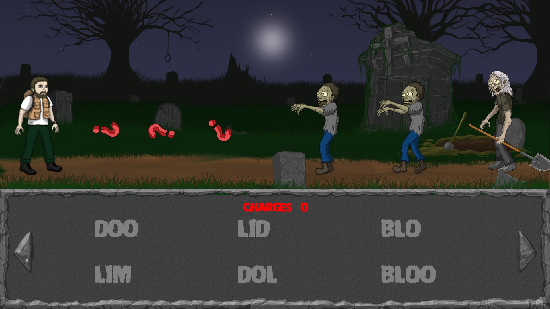 Use your word-finding skills to scavenge weapons and defend yourself from a never-ending horde of zombies. A two-part challenge, the first half tests your literary skills as you find words on a 4x4 grid of letters, while the second half requires you to use those words as weapons to fight off waves of zombies
