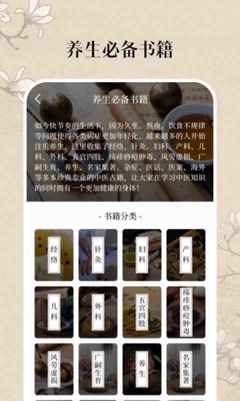 中医,是中华文化的精粹,是东方科学的高奥秘,这里收集了诸多海内外孤本以及古今以来的珍藏中医古籍,涵盖了养生、妇科、产科、外科、针灸、风虚劳损等多个详细分类,是中医爱好者和中医从业人员用于学习和研究的古籍宝库,也是喜欢养生健康人士的入门好物。 【海量古籍宝典】 我们为您收集了从古至今中医养生相关的海量精华孤本,包含历代名家医案和医学经典著作,还有名老中医的宝贵经验著作供您参考学习。 【养生健康】 如今快节奏的生活下,因为久坐、熬夜、饮食不规律等问题使得各类病症更加年轻化,越来越多的人开始注重养生和健康,我们不仅收集了诸多常见病症的古籍医案,还为您匹配了健康养生的视频小知识内容,让您在了解中医知识的同时拥有一个更加健康的身体。